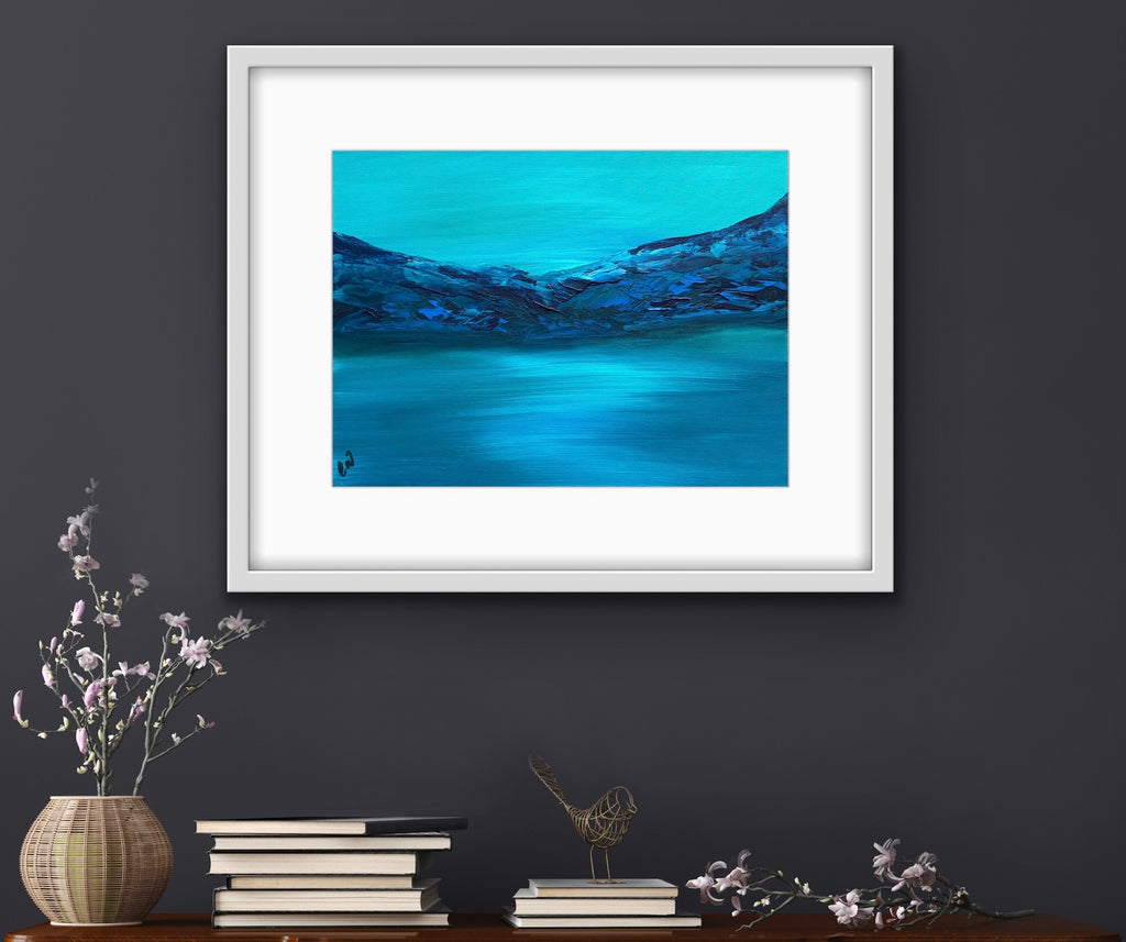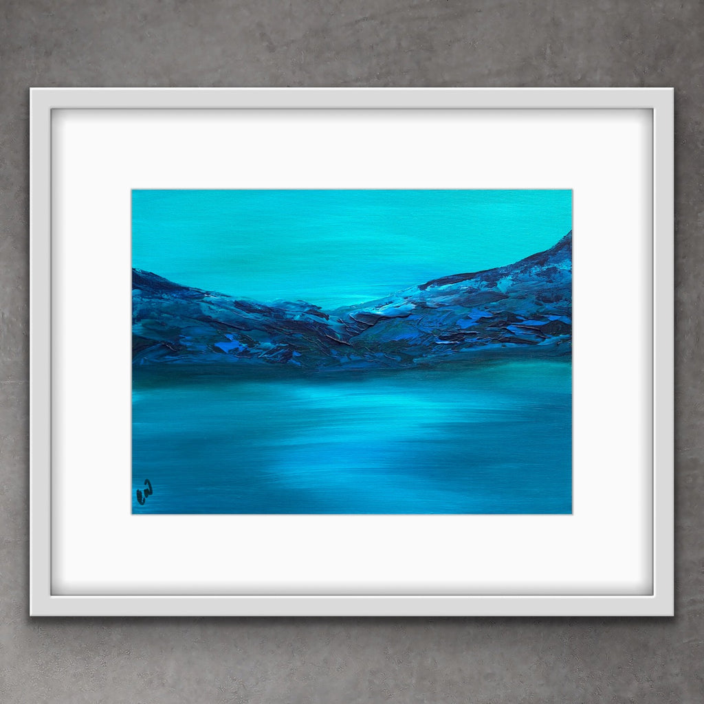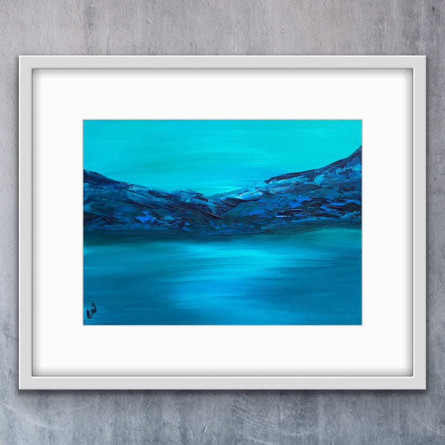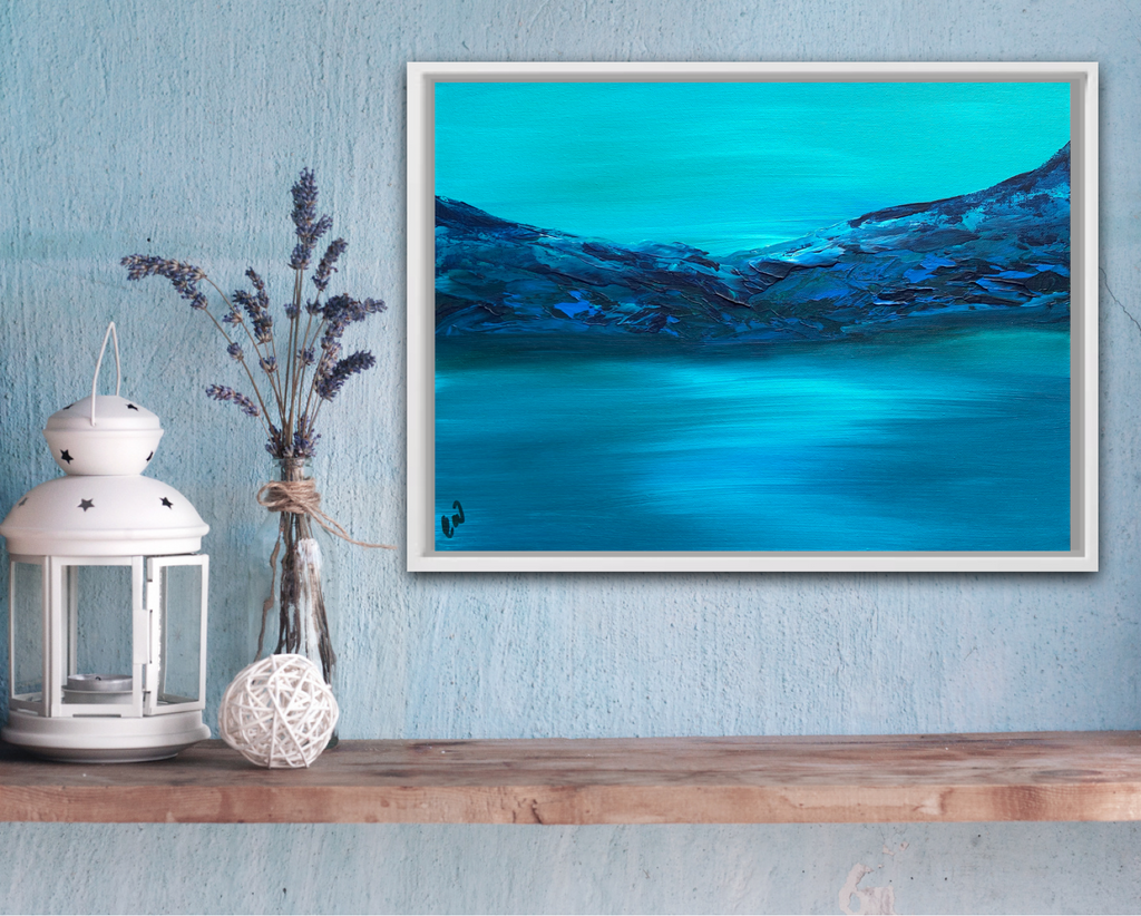 Serene is a beautiful abstract seascape that evokes a peaceful feel. 41 x 30 cm. Acrylic on canvas board. Requires framing. Some images show what this painting will look like framed. Frames not included. No returns on original artworks so please choose carefully.