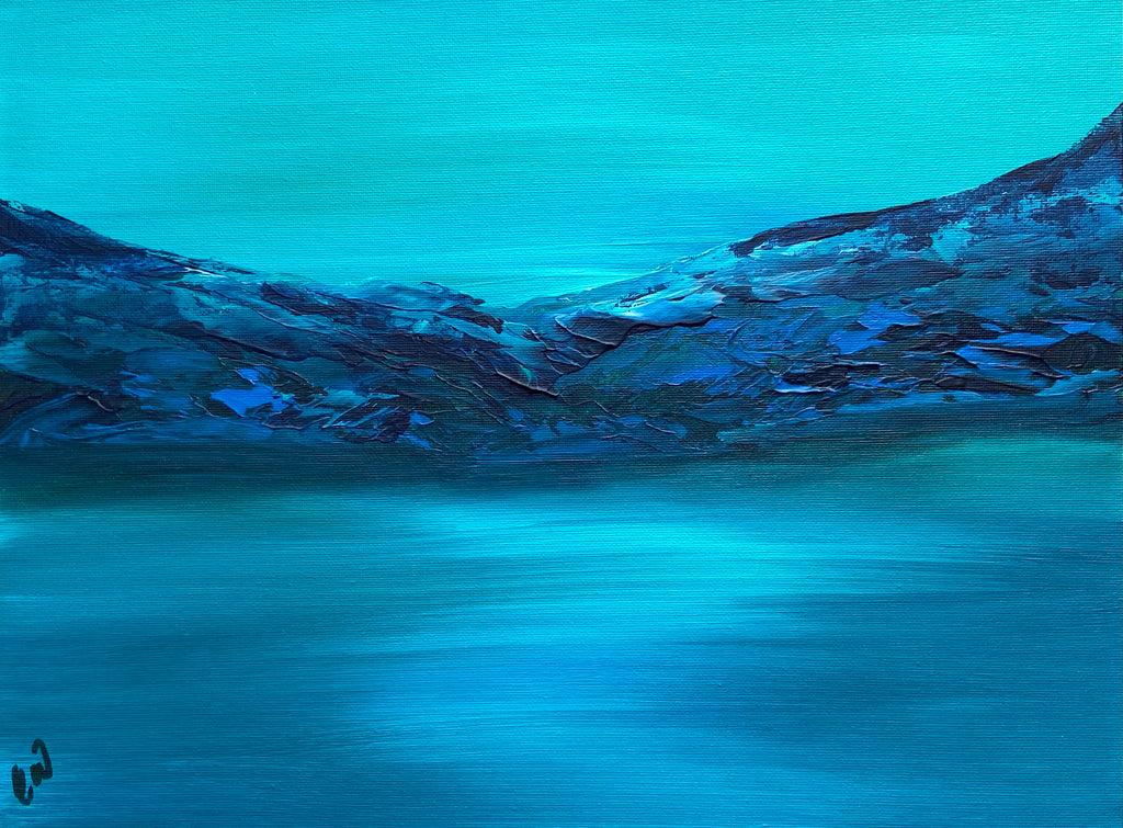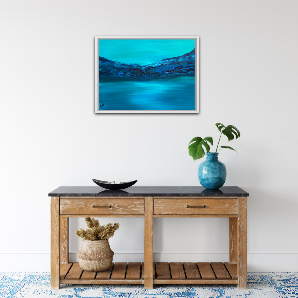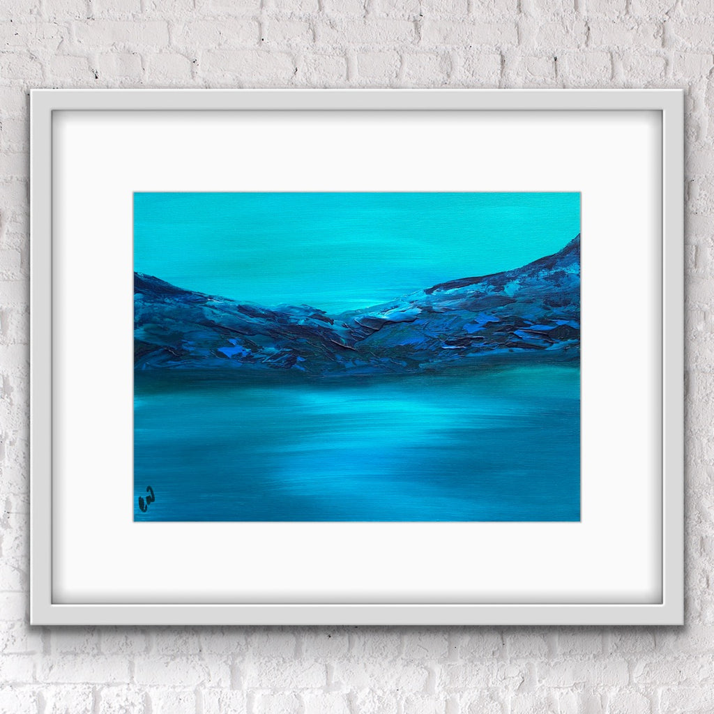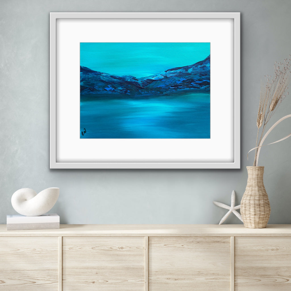 Serene is a beautiful abstract seascape that evokes a peaceful feel. 41 x 30 cm. Acrylic on canvas board. Requires framing. Some images show what this painting will look like framed. Frames not included. No returns on original artworks so please choose carefully.